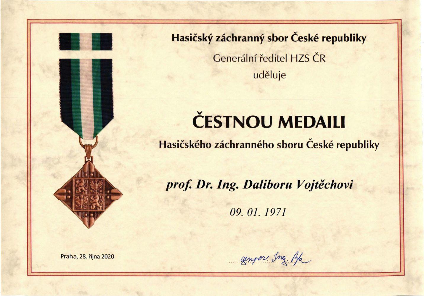 Generální ředitel Hasičského záchranného sboru České republiky genpor. Ing. Drahoslav Ryba udělil Čestnou medaili prof. Dr. Ing. Daliboru Vojtěchovi, vedoucímu Ústavu kovových materiálů a korozního inženýrství a prorektorovi pro vědu a výzkum VŠCHT Praha.